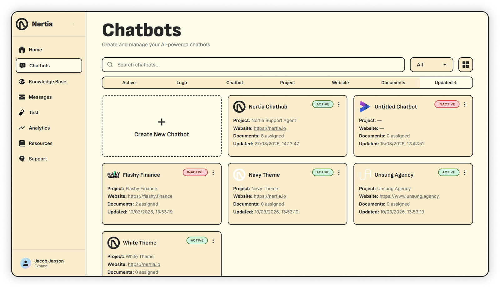 Nertia Chatbot dashboard is a focused AI support solution designed to help businesses respond faster, stay available, and provide consistent assistance across their website. It gives you a central place to build, design, manage, and deploy intelligent chat experiences that feel helpful, natural, and on-brand.